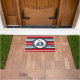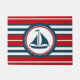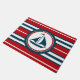 Nautical design with sailing boat decoration in round shape on red, blue and white striped background