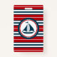 Nautical design with sailing boat decoration in round shape on red, blue and white striped background