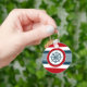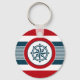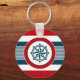 Nautical design with compass decoration in round shape on blue, red and white striped background