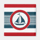 Nautical design with sailing boat decoration in round shape on blue, red and white striped background