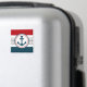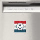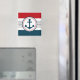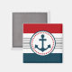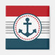 Nautical design with anchor decoration in round shape on blue, red, grey and white striped background