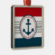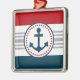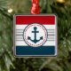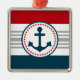 Nautical design with anchor decoration in round shape on blue, red, grey and white striped background