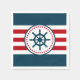 Nautical design with sailing wheel decoration in round shape with stars on red, blue and white striped background