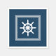 Nautical themed design with sailing wheel decoration in striped squares on blue background