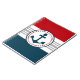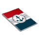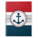 Nautical design with anchor decoration in round shape on blue, red, grey and white striped background