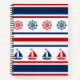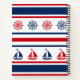 Nautical design with sailing boat and compass decoration on red, blue and white striped background