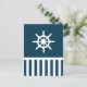 Nautical design with sailing wheel and blue and white stripes decoration on blue background