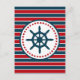 Nautical design with sailing wheel decoration in round shape with stars on red, blue and white striped background