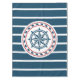 Nautical design with compass decoration in round shape on blue and white striped background