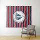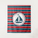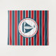 Nautical design with sailing boat decoration in round shape with stars on red, blue and white striped background