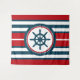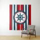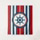 Nautical design with sailing wheel decoration in round shape on red, blue and white striped background