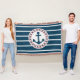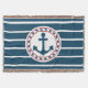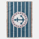 Nautical design with anchor decoration in round shape on blue and white striped background