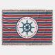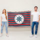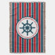 Nautical design with sailing wheel decoration in round shape with stars on red, blue and white striped background