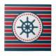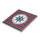 Nautical design with sailing wheel decoration in round shape with stars on red, blue and white striped background