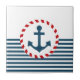 Nautical design with anchor decoration in round shape on blue and white striped background