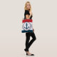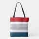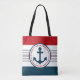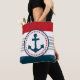 Nautical design with anchor decoration in round shape on blue, red, grey and white striped background