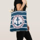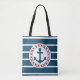 Nautical design with anchor decoration in round shape on blue and white striped background
