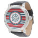 Nautical design with compass decoration in round shape on red, blue and white striped background
