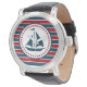 Nautical design with sailing boat decoration in round shape with stars on red, blue and white striped background