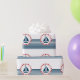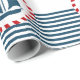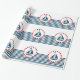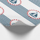 Nautical design with sailing boat decoration in round shape on blue and white striped background
