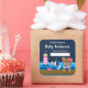 This cute and fun baby shower bookplate features a nautical sailor girl bear on a wooden deck with a seagull and a crab. In the background there is a pink and white lighthouse, a cute bird on a sailboat, ocean waves and a navy blue starry night sky. The text combines bold and serif fonts for a stylish and modern look. This is perfect for a nautical themed baby shower.