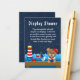 This cute and fun display shower enclosure card features a nautical sailor girl bear on a wooden deck with a seagull and a crab. In the background there is a red and white lighthouse, a cute bird on a sailboat, ocean waves and a navy blue starry night sky. The text combines bold and serif fonts for a stylish and modern look. This is perfect for a nautical themed baby shower.