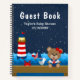 This cute and fun guest book features a nautical sailor girl bear on a wooden deck with a seagull and a crab. In the background there is a red and white lighthouse, a cute bird on a sailboat, ocean waves and a navy blue starry night sky. The text combines bold and serif fonts for a stylish and modern look. This is perfect for a nautical themed baby shower.