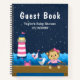 This cute and fun guest book features a nautical sailor girl monkey on a wooden deck with a seagull and a crab. In the background there is a pink and white lighthouse, a cute bird on a sailboat, ocean waves and a navy blue starry night sky. The text combines bold and serif fonts for a stylish and modern look. This is perfect for a nautical themed baby shower.