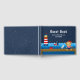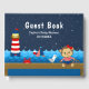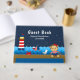 This cute and fun guest book features a nautical sailor girl monkey on a wooden deck with a seagull and a crab. In the background there is a red and white lighthouse, a cute bird on a sailboat, ocean waves and a navy blue starry night sky. The text combines bold and serif fonts for a stylish and modern look. This is perfect for a nautical themed baby shower.