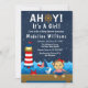 This cute and fun invitation features a nautical sailor girl monkey on a wooden deck with a seagull and a crab. In the background there is a red and white lighthouse, a cute bird on a sailboat, ocean waves and a navy blue starry night sky. The text combines bold and serif fonts for a stylish and modern look. This is perfect for a nautical themed baby shower.