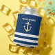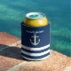 Nautical, Gold Anchor Navy Blue Striped Can Cooler