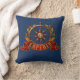 This nautical themed pillow features a brown wooden ship's wheel accented by gold leaves and a red banner that reads "Captain" on a navy blue background. Designed by Susan Coffey.