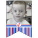 Nautical themed red and blue Happy 5th birthday party bunting. Personalise with your child's own birthday year and two of your favourite photos of the birthday boy. Currently reads Happy 5th Birthday. Matches other items in the Nautical collection. Features a nautical red and blue stripe with anchor design. Art and design by Sarah Trett. www.sarahtrett.com for www.mylittleeden.com