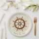Wooden sailboat helm wheel and navigational compass on textured neutral background with boat name.