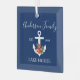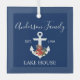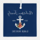 Stylish Script Nautical Lake House Family Name Navy Blue Glass Ornament. Anchor topped with Watercolor Floral including red poinsettias, pine cones and other beautiful winter greenery.