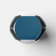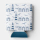 Cool nautical can coolers printed with a blue and white pattern of beach huts and lighthouses.