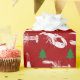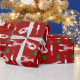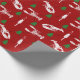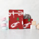 Give your Christmas gifts a nautical touch with this wrapping paper. It features a pattern of white lobsters and vintage wooden fishing buoys against a red background with festive green Christmas tree accents.