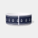 This midnight blue pet bowl has a row of white anchors around the bowl.