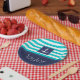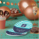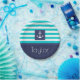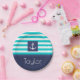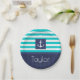Nautical paper plate with turquoise & navy blue striped pattern and customisable text.