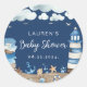 Nautical Navy Baby Shower round Sticker featuring a nautical theme with sea, sea shells, boats, and lighthouse artwork