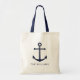 Modern Minimalist Nautical Tote Bag featuring navy blue anchor with personalised name in navy blue modern sans serif font style on white background.