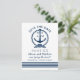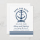 "Tying the knot" wedding save the date cards feature a wedding monogram displayed inside a boat anchor with accents of rope knots and stripes. Nautical navy blue and white colour scheme.