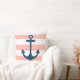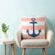 Stylish and chic square accent pillow design features a beachy white and blush coral pink cabana striped pattern with navy blue boat anchor. The blush / light coral pink background colour can be customised.