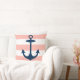 Stylish and chic square accent pillow design features a coastal pattern of wide white cabana stripes with a navy blue boat anchor. The blush / light coral pink background colour can be customised.