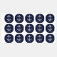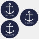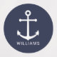 Modern Minimalist Nautical Round Labels feature white anchor with personalised name in white modern sans serif font style on navy blue background.