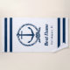 Nautical beach towel in a vertical format features an elegant boat anchor framed by a knotted rope and accented with preppy horizontal stripes. Personalise the custom text with your boat name and location. Design includes a classic coastal navy blue and white colour scheme.