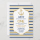 This nautical birthday invitation features an gold gliter anchor and the word -ONE-on a navy blue, white and gold glitter stripes background.