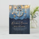 Nautical-themed rehearsal dinner invitations featuring a vintage anchor, seashells, starfish, twinkling string lights, rustic wood, and navy blue ocean waves. Designed in gold and deep navy marine tones, this rehearsal dinner invitation is perfect for a seaside celebration - whether on the beach, by the coast, or aboard a yacht.