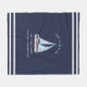 Create unique personalised nautical fleece blanket in navy blue and white colours for your lake house or a boat. Life is Better at the Lake saying is decorated with a sailboat illustration with sky blue and white sails. The template makes it easy to type your Family name.