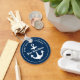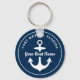 Round nautical keychain design features a simple, stylish navy blue and white coastal style design with boat anchor accent. Personalize the custom text with the name of your boat and her location city and state.